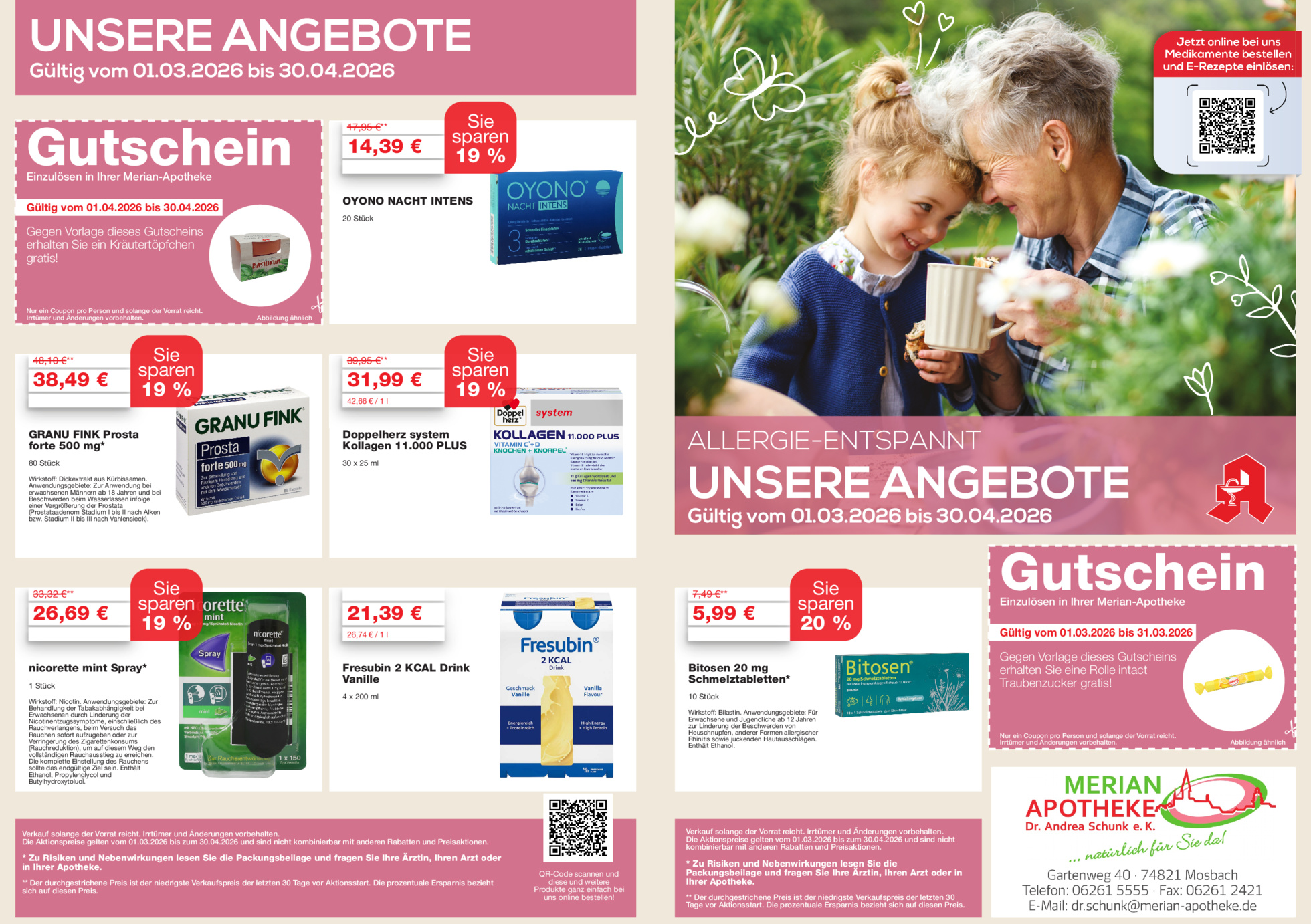 Fragen Sie uns nach unserem Flyer mit den günstigen Angeboten bei Ihrem nächsten Besuch in Ihrer Merian-Apotheke.